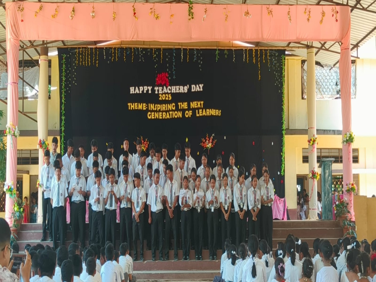 The Teacher’s Day Celebration at Don Bosco School, Bishramganj was held with great joy and enthusiasm on 5th September 2025 in the school assembly hall. The programme was organized in two separate venues – the Lower Primary section at the Parish Campus, while the rest of the students gathered in the main school campus.